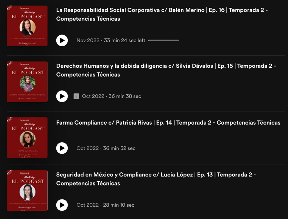 Para ser parte de estas experiencias puedes escucharlas a través de nuestro canal de Spotify – Mujeres en Compliance.